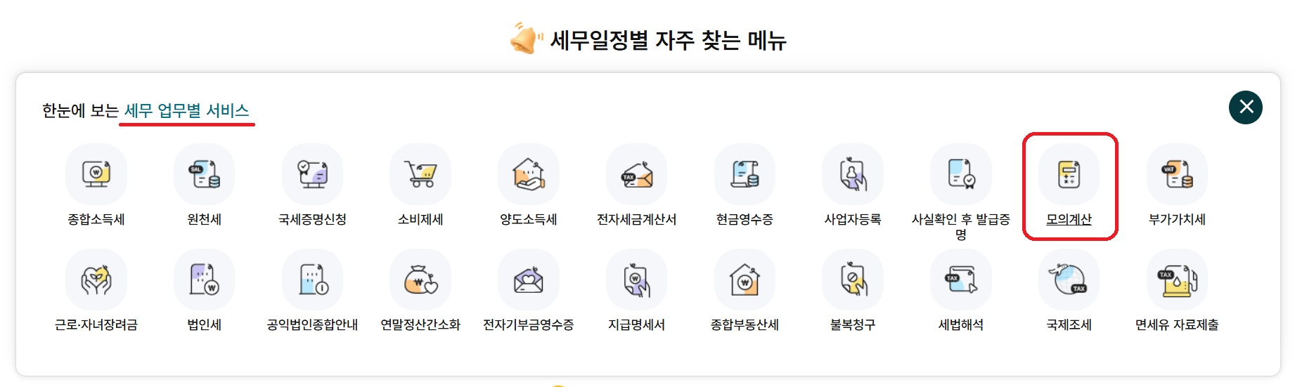 홈텍스 메인화면 오른쪽 하단으로 가면 세무별업무서비스에 모의계산으로 들어갑니다.